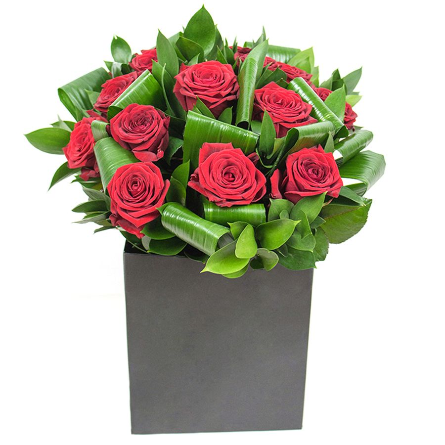 Discover the elegance of our exquisite bouquet, featuring red roses intertwined with aspidistra leaves and ruscus.